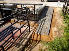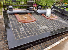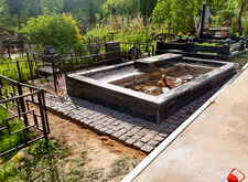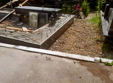 Приступаем к работе с цветниками. Один уже был в наличии, поэтому делаем второй, идентичный. По проекту цветники должны смотреться одинаково даже несмотря на то, что памятники будут разные. В это же время укладываем гранитную брусчатку уже на территорию места захоронения.