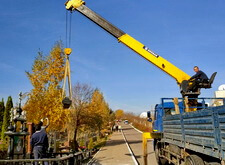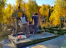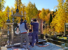 Начинается процесс монтажа. Доставляем памятники, крепим их, приклеиваем и насаживаем на штыри все конструктивные элементы надгробий.