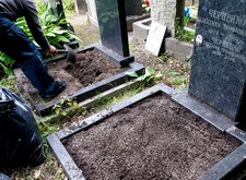 Закончив с первой могилой, мы приступили ко второму месту захоронения: засыпали новой землёй заранее прополотый цветник.